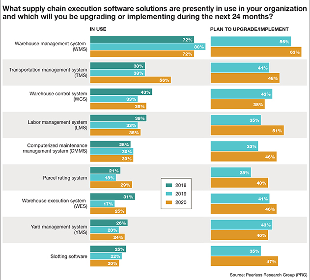 Over the next 24 months, 63% of companies are planning to implement WMS (up from 56% in 2019); 51% want to add labor management system (LMS); 48% plan to adopt TMS; and 47% want to start using slotting software. Finally, the number of respondents that plan to adopt a parcel rating system increased from 28% in 2019 to 40% in 2020.