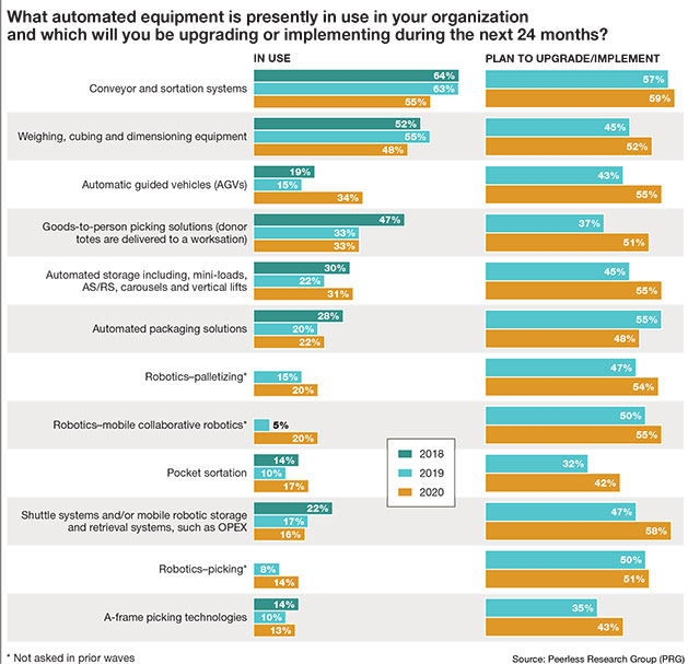 Looking out 24 months, conveyor and sortation systems remain at the top of the respondents’ shopping lists, with 59% saying they plan to include them in their operations in the future. Fifty-eight percent plan to invest in shuttle systems and/or mobile robotic storage and retrieval systems (versus 47% in 2019), while 54% plan to implement palletizing robots (up from 47% last year). Goods-to-person picking solutions saw a large uptick, with more than half of respondents (51%) planning to implement this equipment (up from 37% last year).