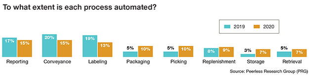 Asked to what extent each of their current warehouse or DC processes is fully automated, the numbers are fairly low, with some dropping since Modern’s 2019 survey. For example, while 15% of companies either have automated reporting or conveyance processes, those numbers fell from 17% and 20% (respectively) over 2019. The use of automated labeling has also decreased, falling to 13% in 2020 (versus 19% in 2019).