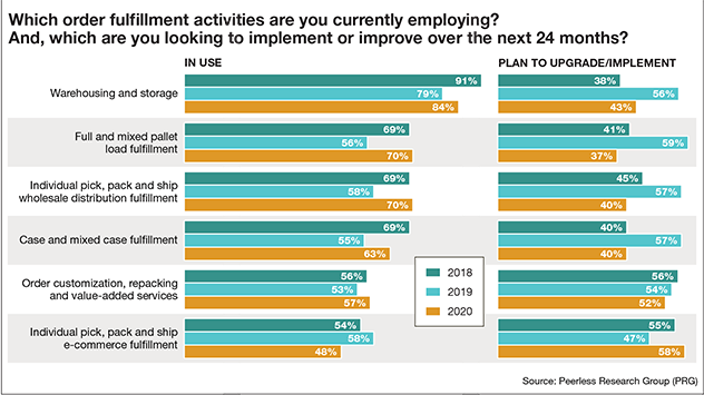In terms of order fulfillment activities, most companies (84%) use warehousing and storage; full and mixed pallet load fulfillment (70%); and individual pick, pack and ship wholesale distribution fulfillment (70%). Sixty-three percent are using case and mixed case fulfillment (up from 55% last year), and 57% are using order customization, repacking and value-added services (versus 53% in 2019). The only decline was in individual pick, pack and ship e-commerce fulfillment, which fell from 58% usage in 2019 to a current 48%.