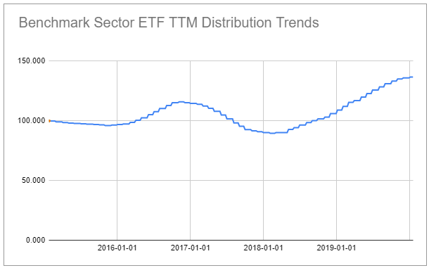 A pair of metrics we like to follow is the combination of sector covered yield and 3-year sector percent distribution change, which we plot below. Covered yield is the average sector current yield multiplied by the average sector distribution coverage and approximates the earnings yield of the sector. It is quite an effective metric because it is a combination of three key earnings and yield drivers: sector distributions, discount and coverage.