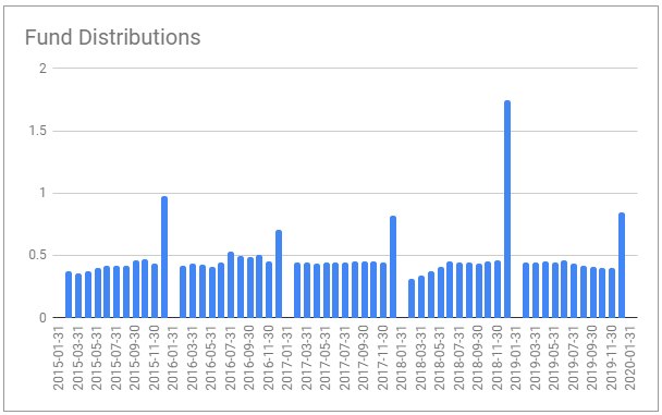 In the chart below, we plot distributions from the sector ETF benchmark, the iShares J.P. Morgan USD Emerging Markets Bond ETF (EMB). Although distributions have come down somewhat in the last few months, they are not a million miles away from the broad trend of the last few years.