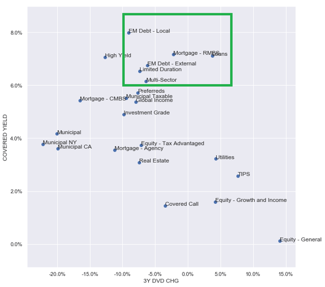 The green box in the chart below includes those sectors that have a high covered yield with relatively stable distributions over the last few years. In this article, we will focus on three sectors we find particularly attractive: non-agency residential mortgage sector, loans and external Emerging Market debt.