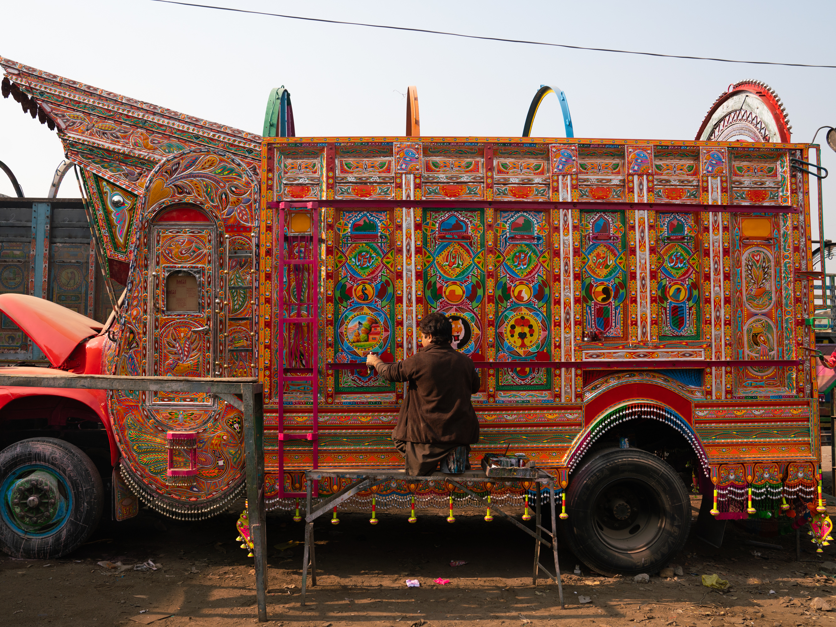 “When we decorate it, we hope people will look at our truck with love,” says Muhammad Ijaz Mughal, a longtime truck artist who learned the craft from his father and now runs a small studio from his home. “When a truck is decorated, we consider it to be like a bride and decorate it and take care of it.”