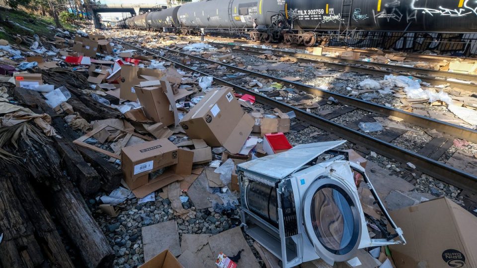 Dozens of packages were stolen out of cargo containers in downtown Los Angeles, leaving the train track cluttered with shredded boxed, UPS packages and debris.