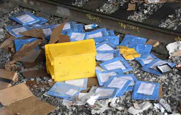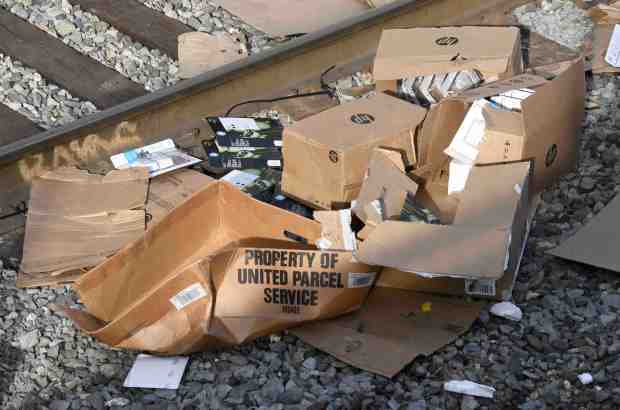 Passing trains carried containers with doors wide open and packages tumbling out, NBC4 reported. Video showed two men, one holding what looked like bolt cutters, walking along the tracks, the station said.
