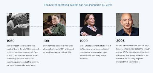 AWS currently has over a $70B run rate so it may come as a surprise to some people that most workloads running on it are using an operating system that is 30 years old and is essentially the same as an even older operating system that is 50 years old. This operating system was built for real physical computers – not the virtual ones that developers spin up on Amazon and Google Cloud. Of course we are talking about Linux.