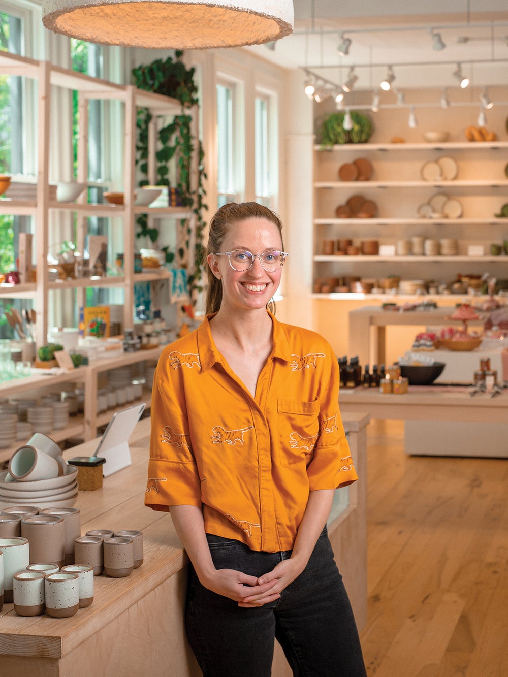 One of the focuses of East Fork is creating a warm, welcoming, inclusive environment. I try to make sure customers feel comfortable asking questions, and that they know they can take their time picking and choosing their items. We sell cutting boards made by Andy McFate, a local woodworker in Asheville, and I love seeing our pottery placed on them as a little charcuterie board. Eggshell is the most popular glaze at the store, and the mug is always a bestseller — especially in the current seasonal glaze, Fiddlehead.