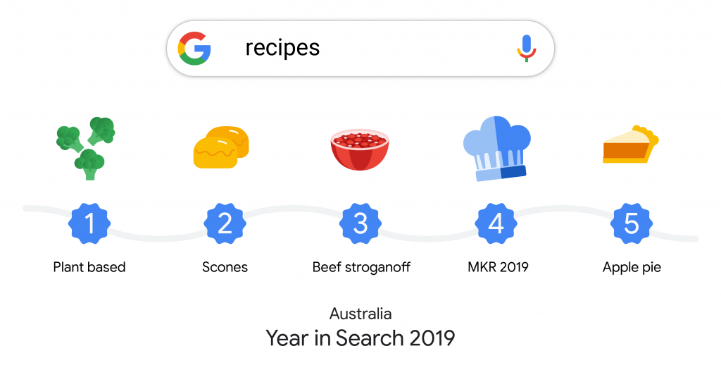 Google is defs the first place you go to look up recipes (RIP to the recipe book industry). Plant-based recipes took out the top spot for searches in this category. There have been quite a few docos on Netflix this year about veganism and plant-based diets, so makes sense to see people ditching processed stuff for greens. Turns out we’re also still intrigued by particular diets – the keto diet got it’s fair share of searches this year. Good to see the classic scone is still going strong though.