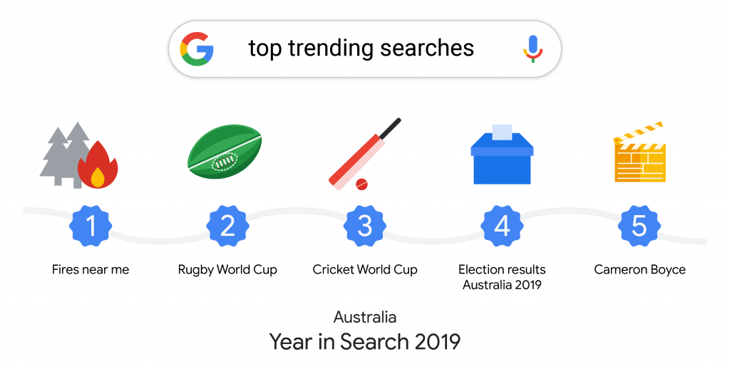 It’s no secret that we’re a nation that lives and breathes sport. Our Google searches defs confirmed that this year – the rugby and cricket world cups were second and third respectively out of all the top trending searches. The awesome thing this year was the huge amount of searches about female sport and athletes. Ash Barty took out the top spot in the list of top trending Aussies and Tayla Harris was the top footy player. Searches about the Women’s World Cup also made it into the top 10 of searches about Australian sport events. YTG!