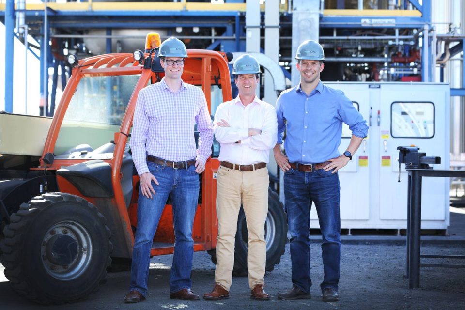 (L to R) Rob Hanson, CEO and cofounder, Bill Brady, director, and Pete Johnson, cofounder at Monolith’s first production plant.