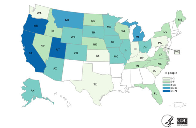 States with confirmed Salmonella Newport patients include: AK with (6), AZ (14), CA (49), CO (10), FL (3), ID (5), IL (10), IN (2), IA (15), KS (1), KY (1), ME (4), MD (1), MI (23), MN (10), MO (6), MT (33), NE (5), NV (5), NY (4), NC (3), ND (5), OH (7), OR (71), PA (2), SC (1), SD (11), TN (5), TX (1), UT (61), VA (4), WA (2), WI (5), and WY (11).