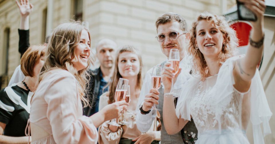 Molly was gorgeous, of course, in a flowing white dress. Pasha wore a pink suit with a checked vest and a lacy white cravat that complemented Molly’s arm veils. The bride and groom both wore white sneakers and masks as they assembled with their group outside the wedding venue.