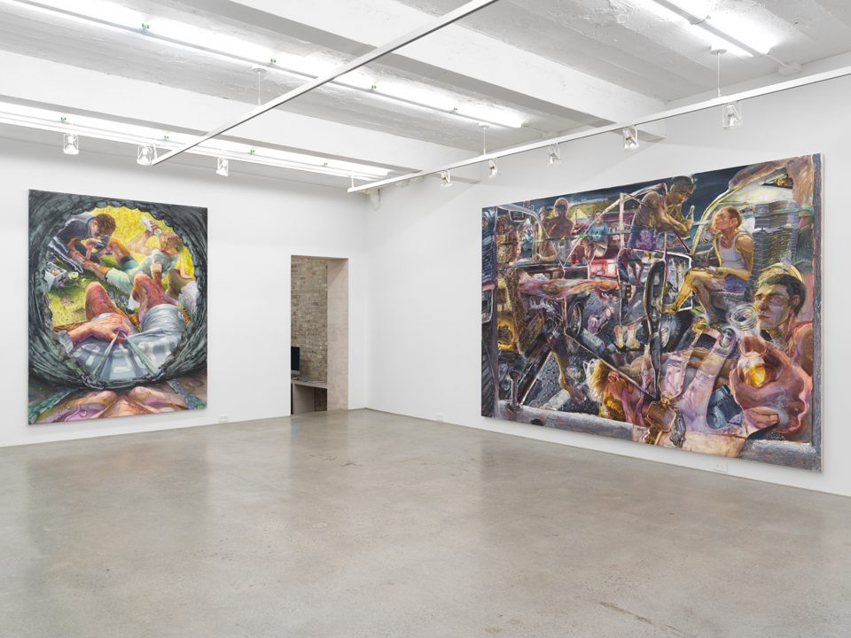 Whether the exit velocity through the self is able to arrive at something more transcendent or critical seems secondary to what Lundy’s multiple indexing allows. Spark up, gas down (2021) accelerates her ideas and scale to the genre of history painting. An open, invisible car door is a compositional device that divides up the bodies within the scaffolding of a parking lot hangout. For every panic attack felt in the forced first-person perspective the painting sets up, you are also made aware of the bodies of others. With the fear of being a poser, there’s also the chance of finding community, the thrill of romantic possibility, and the luxurious in-between of being bored and having nothing to say on a Friday night.