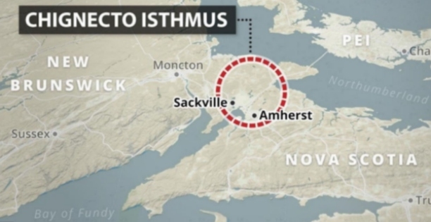 The Chignecto Isthmus is a 21-kilometre wide stretch of land linking the two provinces and is the only land bridge connecting them. An estimated $35 billion worth of trade is conducted annually via this corridor between Amherst, NS and Sackville, NB.