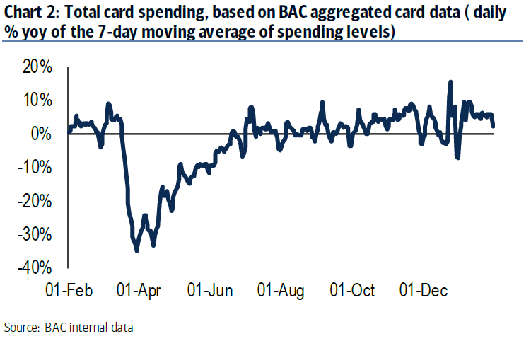 However, Bank of America did highlight that the boost to spending from stimulus checks is waning. Total card spending for the lowest income cohort settles back in-line with the pre-stimulus spending range of up 10% yoy, a sharp decline from the peak of 22% up yoy the week of Jan. 10.