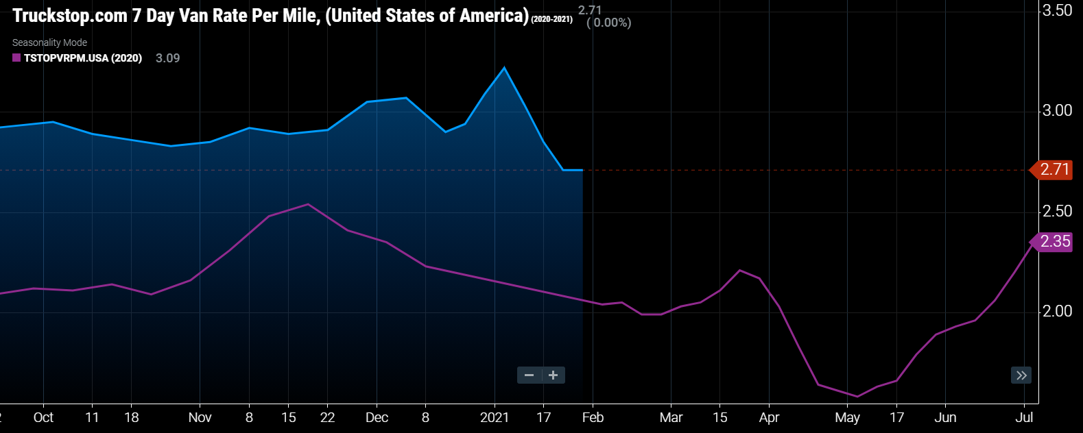 Our thesis on spot rates remain unchanged: We expected spot rates to fall once they reached well above $3 per mile. We do expect spot rates to stay elevated by historical and y/y standards over the coming weeks and months as retail inventories are replenished, stimulus checks are disbursed (which is and should continue to reaccelerate consumer demand) and as the industrial economy in the U.S. (and globally) continues to recover.