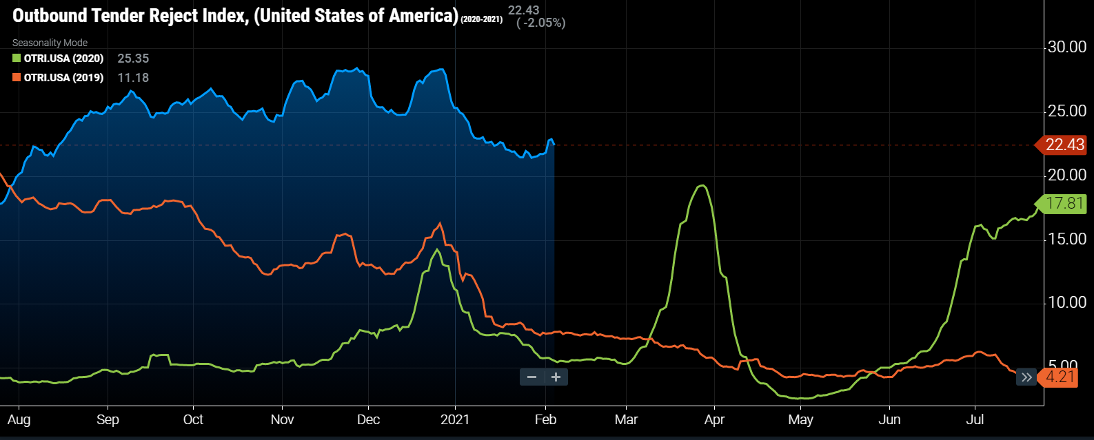 Carriers are rejecting freight at historically striking levels, but the market seems to be getting accustomed to it. We’ve heard from our calls with brokerages that capacity is not as hard to secure as it was in the back half of 2020, even with carriers rejecting nearly 1-in-4 contracted tenders.