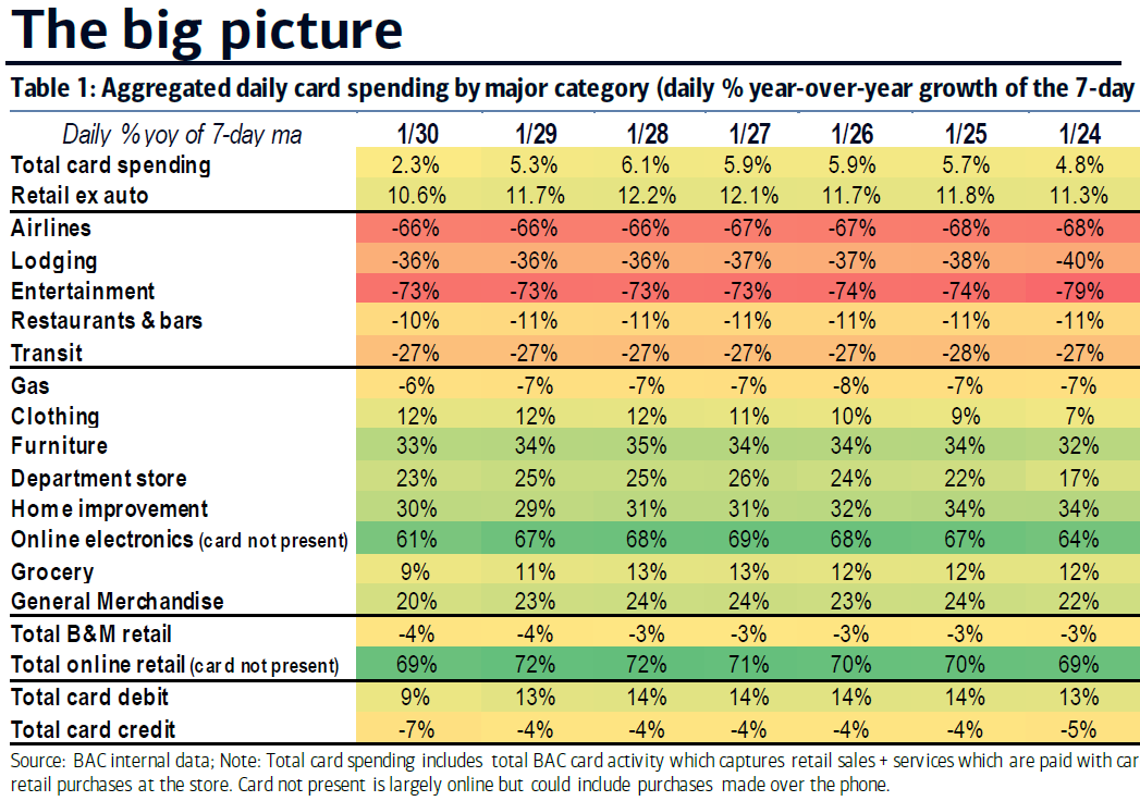 Turning to consumer spending as measured by Bank of America weekly card (both debit and credit) spending data, total card spending in the latest week available was up 2.3% year-over-year. The picture is more optimistic when focusing on retail spending excluding auto, which was up 10.6% year-over-year last week. Overall card spending decelerated materially this week from 5% year-over-year last week. However, it is important to note the fact that the week ended on a payday (Jan. 30), which badly distorted the data. Backing out that effect, consumer card spending last week was up 5.3% and in-line with the recent trend.
