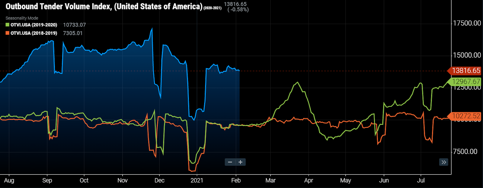 Freight volumes have been walking the x-axis since the first week of January, bouncing between 13,600 and 14,200. This is typical for the month of January, when freight flows lull in the early weeks of the year. While this year is following a similar pattern, it is at an extraordinarily high level. If the pattern continues, we should expect to see volumes pick up speed toward the end of February.