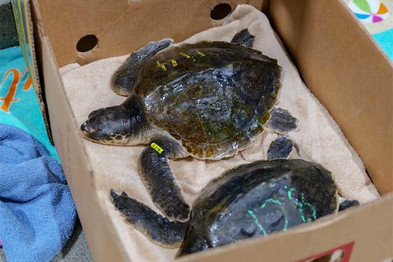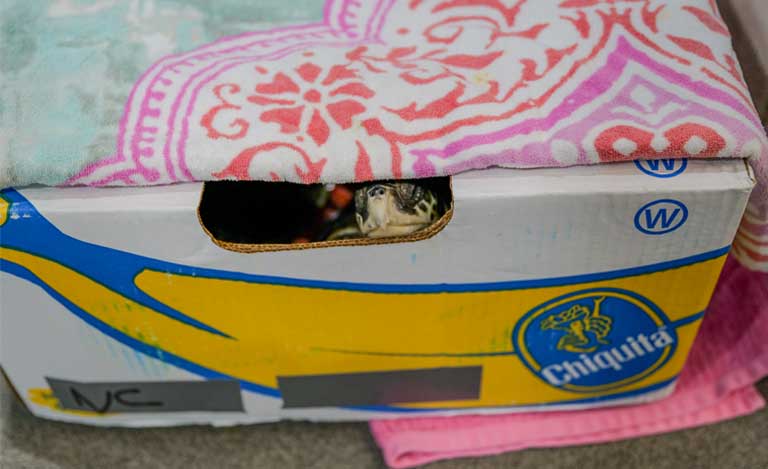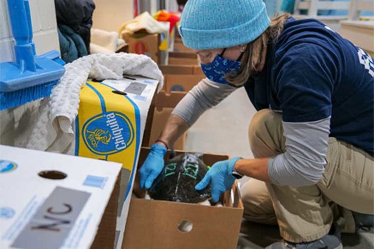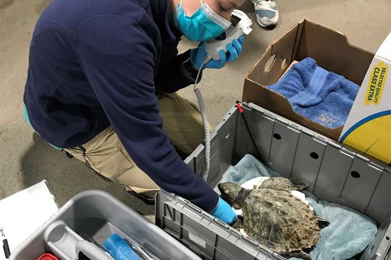 The new arrivals barely move when the covers come off the banana boxes. A cadre of skilled volunteers check each turtle’s vital signs, look for injuries, and administer fluids and antibiotics. Every turtle gets x-rayed to check for pneumonia and other health risks. Some will need blood tests or more intensive care.