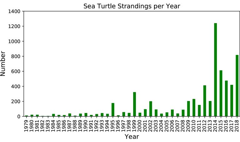 Globally, most cold-stunning events occur on the U.S. Atlantic and Gulf coasts: especially in Massachusetts, North Carolina, Florida and Texas. Last year, more than 10,000 turtles were stranded in Texas alone. Cold-stun events have also been reported in Uruguay, Spain, Canada, Ireland, Denmark, France, and the UAE.