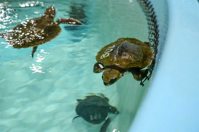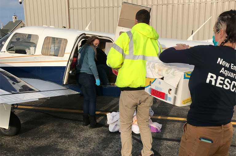 It might be many months before a turtle is ready for release back to the ocean. At the Aquarium’s facility, the aim is to stabilize the turtles as quickly as possible. Once they can swim and dive in 70-plus degree Fahrenheit water, the turtles are cleared for travel and veterinarians work with the National Oceanic and Atmospheric Administration’s (NOAA) Fisheries Service to identify other facilities located across the U.S. for longer term care. Transport volunteers include private pilots with the non-profit Turtles Fly Too, who take the turtles where they need to go.