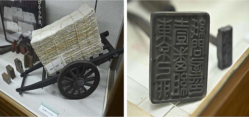 Left: A replica of a daihachiguruma cart for transporting washi during the Edo period Right: A branding iron for impressing a trade association seal on merchandise