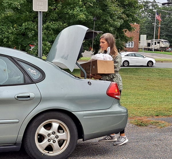 “I just wish there weren’t so many in need,” said Shelley Lynnworth, who has been volunteering at the distribution since it started in March. After 26 weeks of putting boxes of food in trunks and back seats, the group has everything down to a science, working efficiently to load up enough food to ensure the family is fed.