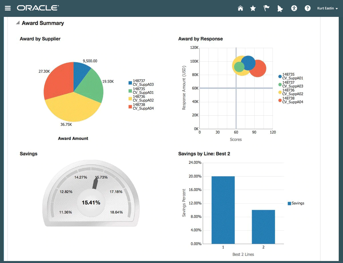 With Oracle’s sourcing solution, collaboration between suppliers is made easy. Improved requirements gathering, document sharing and negotiation effectiveness is delivered by Oracle Social Network. Intuitive tools simplify negotiations and modernise the user experience, whilst insight into spend is easy to access.