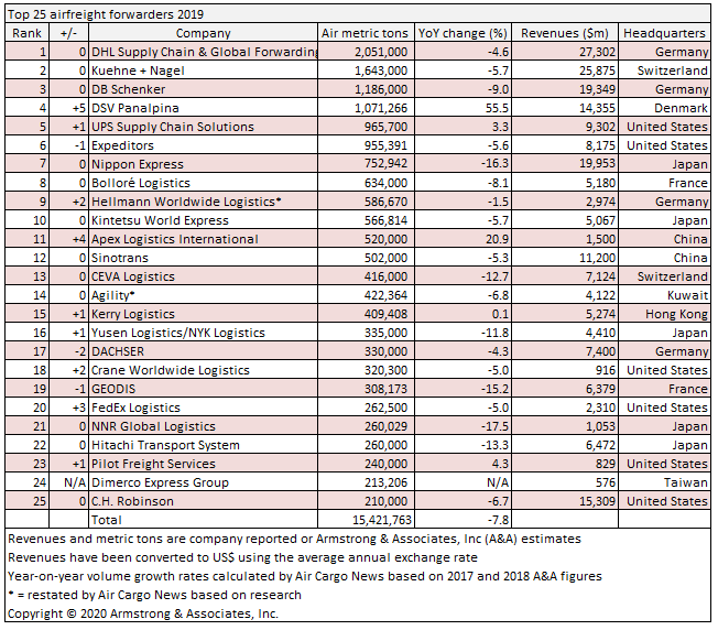 In a year marked by an ongoing trade war between China and the US, DHL Global Forwarding extended its lead as the world’s busiest airfreight forwarder in 2019 ahead of Kuehne+Nagel (K+N) and DB Schenker, while DSV Panalpina pushed into the top four (full table at the end of article).