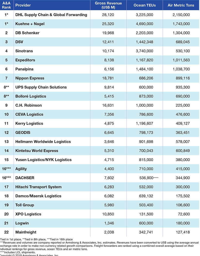 What made that forecast especially prescient was DSV’s purchase of Panalpina this past May, making the new entity the world’s 3rd largest forwarder by revenue and placing it 4th on the current A&A rankings. DSV is now a rival for industry leaders Kuehne+Nagel and DHL Global Forwarding in the current marketplace, according to Richard Armstrong, A&A’s chairman.