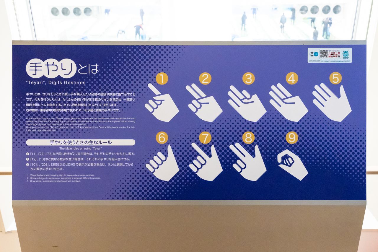 A panel display at the Toyosu Fisheries Wholesale Market explains the hand gestures used in the tuna auctions. (© Kawamoto Daigo)