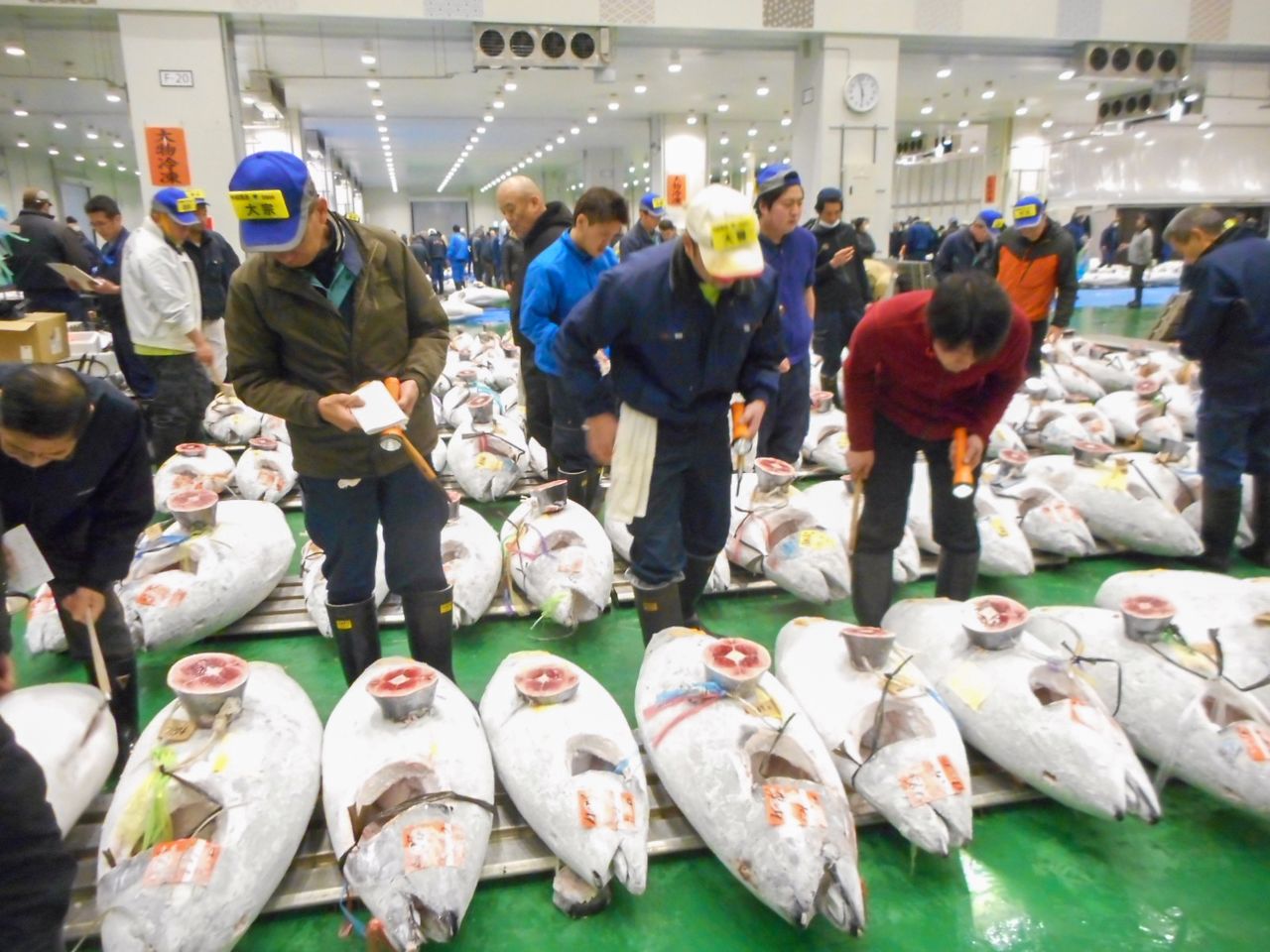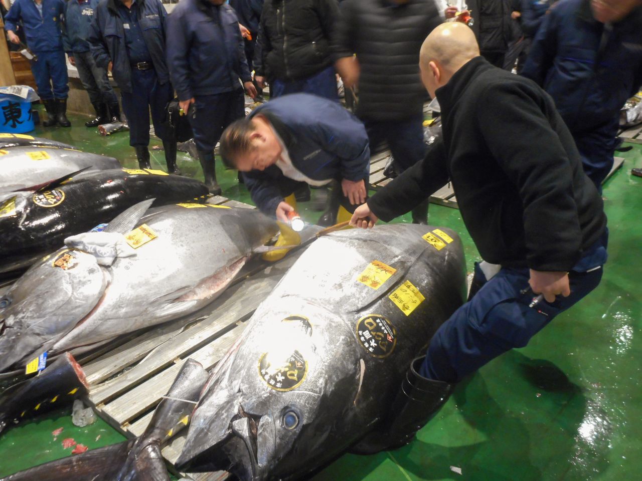 There is wide disparity of size among the tuna placed on auction, and bids are made for each individual fish. Generally, prices are determined by the size and type of tuna. While this is not always the case, the most valued type is Pacific bluefin tuna, followed in descending order by southern bluefin, bigeye, and yellowfin. For Pacific bluefins in particular, auctioneers and bidders alike will make sure to get to the auction early in the morning so that they will have ample time to examine each fish on the auction block and make their selections and estimate prices.