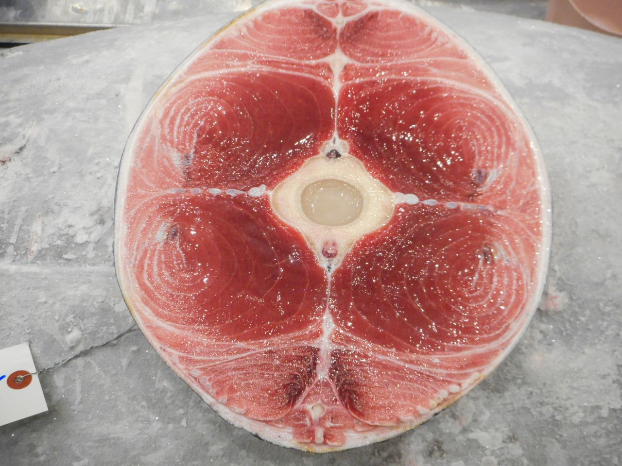 The tail cross-section is critical for evaluating tuna quality. Wholesalers and buyers look at the distribution of fatty tissue, the quality of the red meat—a measure of viscosity and umami—and overall color.