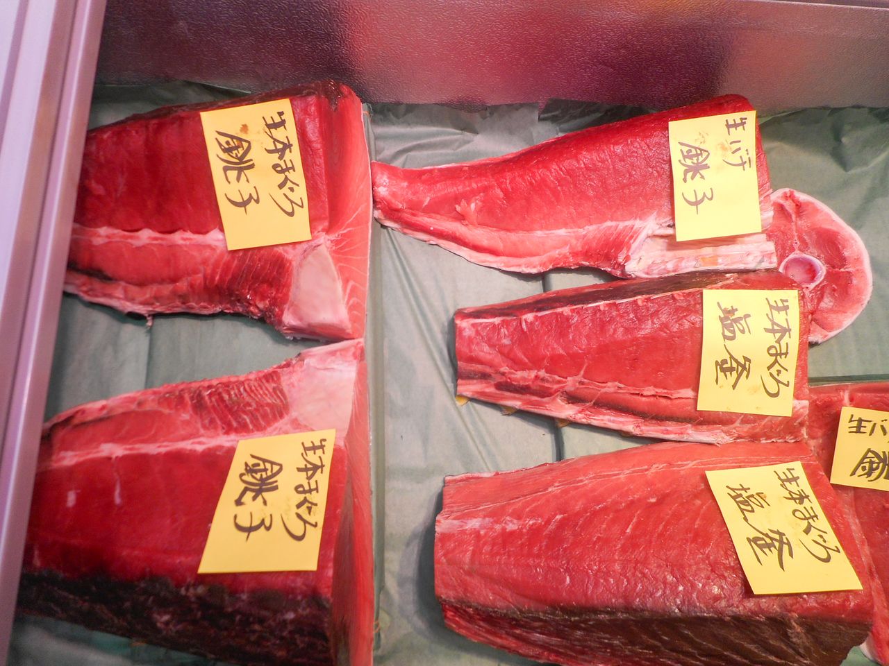 Blocks of tuna from the wholesale market on sale at a retailer catering to sushi shops and restaurants. Each block is marked with the name of its port of origin. (© Kawamoto Daigo)