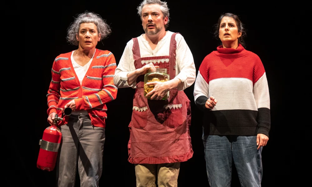 Soo Garay, Paul Dunn, and Zorana Sadiq in Factory Theatre’s Wildfire. Photo by Dahlia Katz.