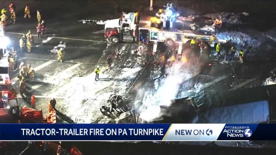 A tractor-trailer burst into flames after a crash on the Pennsylvania Turnpike early Tuesday morning. The crash happened on the westbound part of I-76 between New Stanton (Exit 75) and Irwin (Exit 67) and sent two people to an area hospital. The westbound lanes were closed for nearly four hours. The lanes reopened around 8 a.m.The tractor-trailer was carrying six pallets of car batteries when it rear-ended an Amazon truck at full speed. The Amazon truck was apparently stopped in the narrow space between the travel lanes and the exit lane. The crash caused an explosion, and the tractor-trailer went up in flames, leaking more than 200 gallons of diesel fuel onto the roadway. “With the diesel fuel, we have to call for hazmat, and we called them to come in to assess if there were any environmental impacts,” said New Stanton Fire Chief Robert Commarata. Both drivers were rushed to an area hospital while first responders worked to get the fire knocked down. All westbound drivers were forced to get off at the Somerset exit and follow a lengthy detour. More than 100 people were at the scene, working to get the roadway cleared and reopened quickly. The condition of the two drivers is unknown at this time, but officials said they are expected to survive.
