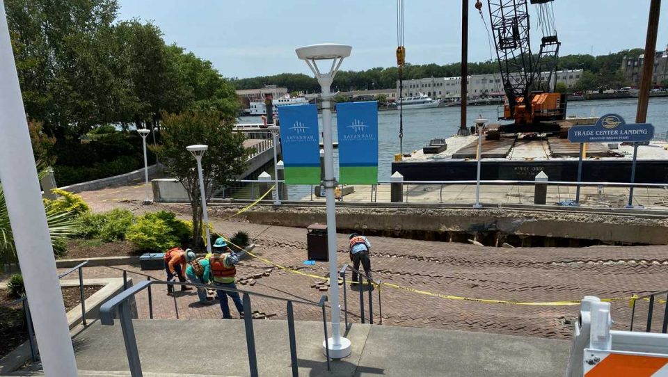 Part of the river walk on Hutchinson Island is closed to foot traffic as city and county crews assess damage for which the cause is still under investigation.The City of Savannah as well as Chatham County both have workers on the plaza that connects the Convention Center and the Westin Hotel.The damage is fairly extensive — a large, gaping hole separates the concrete dock of the of the Savannah Belles Ferry and the brick plaza.Bricks from the walkway are uneven and out of order.Catherine Glasby with the Chatham County Public Information Office told WJCL 22 News that the cause of the damage is still being determined but that it is probably due to the way that the landing was constructed, and not the 3.9 magnitude earthquake that struck early Saturday morning 65 miles away in Metter.Glasby said that they have had issues with the landing in the past.President and CEO Joseph Marinelli declined to speculate as to the cause of the damage by phone and put out the following statement Tuesday afternoon:“Over the weekend we were made aware that problems have developed on the plaza area connecting the Westin Hotel and the Savannah Convention Center on Hutchinson Island. Officials with the City of Savannah and Chatham County have been on-site and continue to inspect the area. Further assessments will be made in the coming days. The affected area, as well as a safety buffer, have been cordoned off and appropriate measures have been taken to secure the area. We are grateful to the team at the City of Savannah for responding quickly over the holiday weekend. As of this morning, we have been informed that Chatham County will be managing the repairs as the site is located on the County’s right-of-way. Our team is in touch with all of the stakeholders and will continue to monitor the situation.”Chatham Area Transit’s ferry operations were disrupted over the weekend over reports of a sinkhole in the same area.Ferry operations have since resumed.