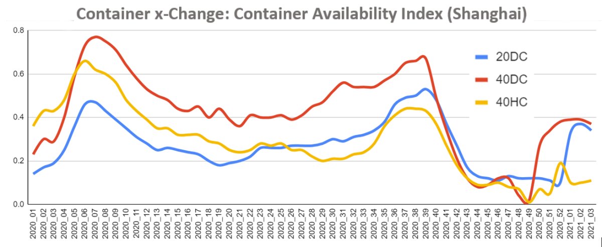 But there are some glimmers of hope. Data on container-equipment availability is tracked by the Container x-Change Container Availability Index. Availability of 40-foot high cubes (40HCs) remains extremely low. But availability of 20-foot dry cargo (20DC) and 40-foot standard dry cargo (40DC) units improved markedly this month.