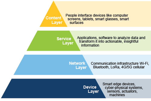 - Device layer: Smart edge devices, cyber-physical systems, sensors, actuators, and machines.