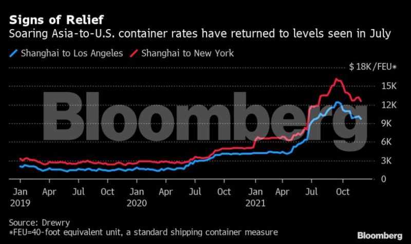 Ocean freight rates on goods shipped to both major U.S. coasts from Asia fell to the lowest levels since July, reflecting an easing of supply strains after the pre-holiday shipping frenzy that fanned inflation fears in the world’s largest economy.