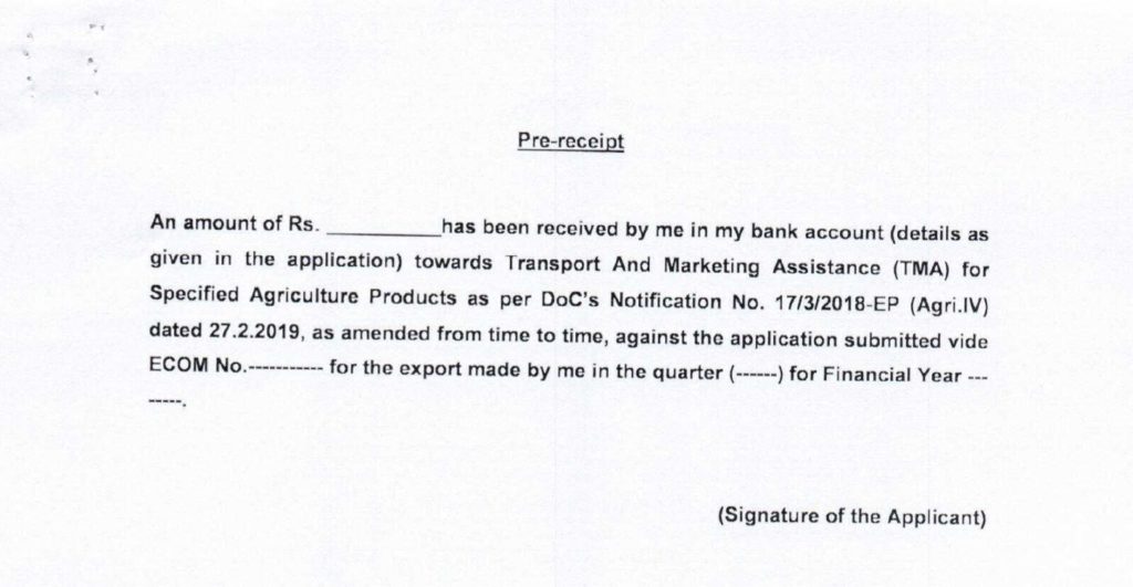 Pre-Receipt Sample Format for Transport and Marketing Assistance Scheme