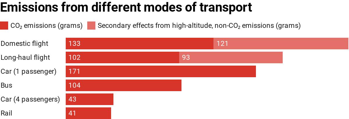 The first thing is to acknowledge that our preferred passenger transport modes of cars and planes cause more emissions than trains, buses, cycling and walking. For example, CO₂ emissions per passenger km can be 171 grams for a passenger car as against 41g for domestic rail.