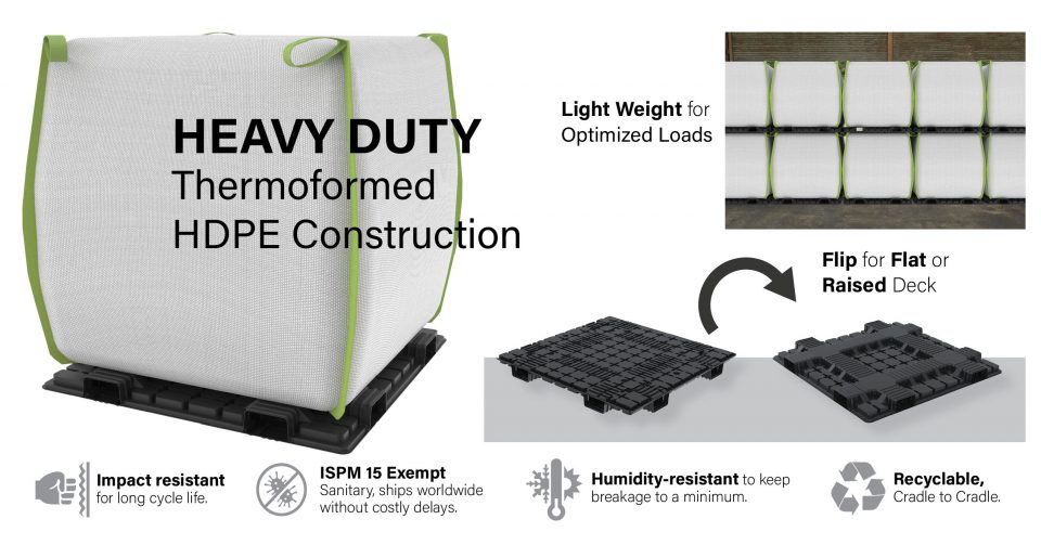 “This new solution was developed, in large part, to help prevent damage and contamination to FIBC loads, which customers stressed as a great need,” explained Nate Franck, Vice President of Sales. “We also knew through research that the market called for a reusable, recyclable, and contamination-free material handling solution to replace wood and cardboard. Our plastic Bulk Bag Pallet specifically meets the demands of producers who require their cargo to arrive undamaged at its destination, whether transporting domestically or internationally.”