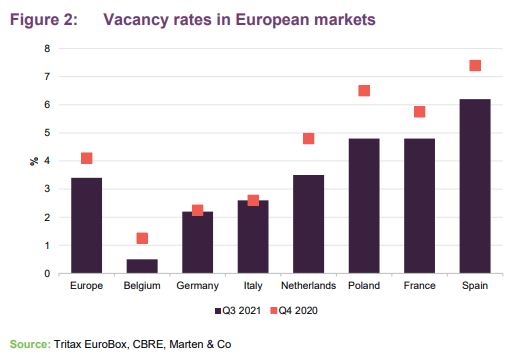 There is a severe shortage in supply of logistics property across Europe, the manager states, with vacancy rates continuing to fall due to several factors including a limited number of sites available to deliver new logistics schemes and zoning or permit constraints (especially in Germany and the Netherlands). Overall, European logistics vacancy rates have fallen by an average of 80 bps over the past 12 months to 4.6%, according to Savills. This is even more acute in some markets, with EBOX’s manager estimating that the unweighted average across Belgium, France, Germany, Italy Netherlands, Poland and Spain being 3.4%, as shown in Figure 2.