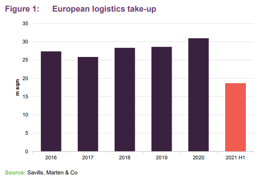 European logistics take-up reached 18.7m sqm in the first half of 2021, according to Savills, which is 63% above the half-year average. It is on course to surpass the record take-up levels achieved in 2020. Germany (3.9m sqm, 28%), the Netherlands (3.9m sqm, 64%) and Poland (3.4m sqm, 102%) performed the strongest against their five-year averages.