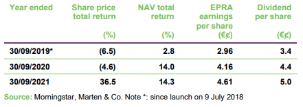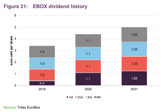 EBOX’s quarterly dividend is declared in euros and paid, by default, in sterling (although shareholders can elect to receive dividends in euros). The euro/sterling exchange rate is determined following the dividend declaration. In the 2021 financial year EBOX paid 5 euro cents per share in dividends. This is a 13.6% increase on the 4.4 euro cents paid in 2020. It paid 3.4 euro cents per share in the period from launch to 30 September 2019.
