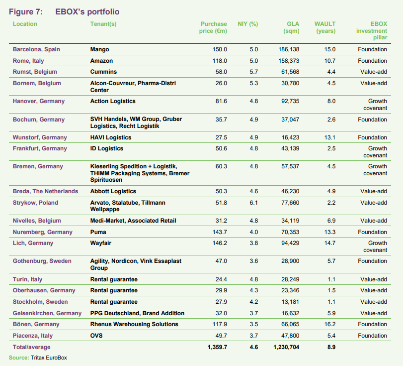EBOX’s manager states that an important driver of future returns for the company is through increased exposure to developments. EBOX has exclusive partnerships with two specialist logistics developers and asset managers – Dietz AG and Logistics Capital Partners (LCP) – that offer it asset management expertise on its current portfolio and access to their respective development pipelines. EBOX has first right of refusal over the two developers’ pipelines, providing it with acquisition opportunities in some of the best logistics locations across continental Europe.