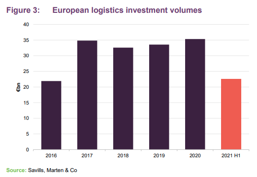 The long-term structural characteristics that make up the European logistics market has allowed investors to underwrite their acquisitions with increasing rental growth assumptions. This led to a record level of investment in European logistics in 2020, with 2021 looks to be on course to better this. According to Savills, European logistics investment reached a record €22.5bn during the first half of 2021, a 60% increase on the five-year half year average.